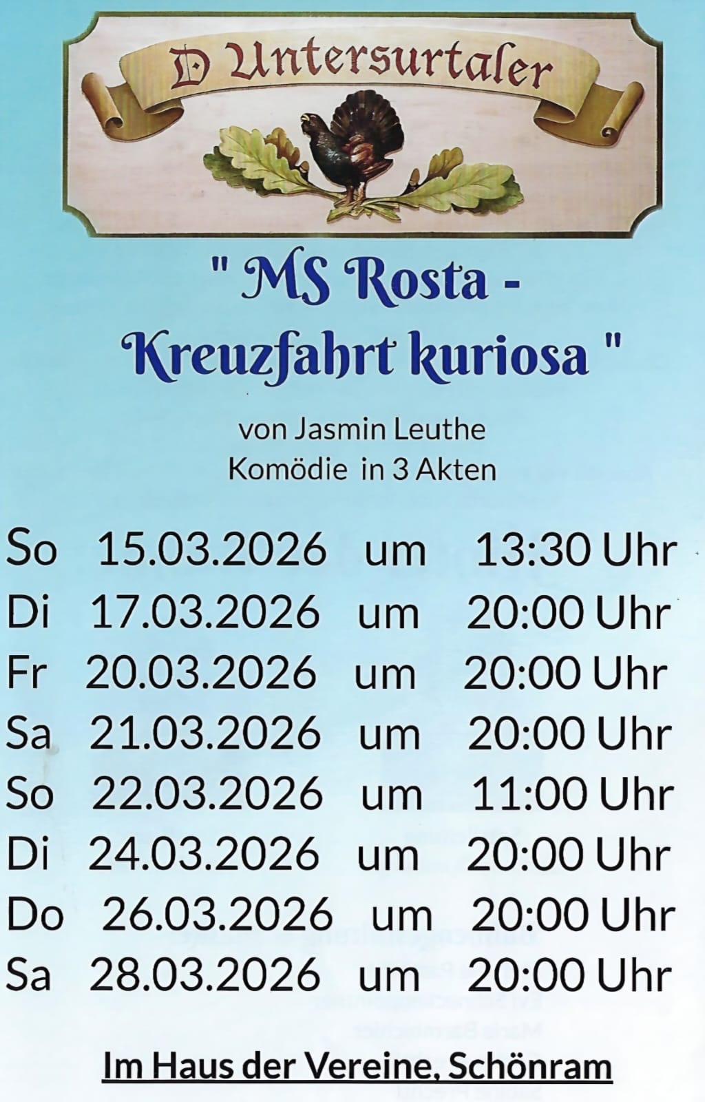 Schon seit dem Gründungsjahr des Trachtenvereins 1949 widmet sich dieser dem Theaterspiel. Seitdem werden in Schönram regelmäßig volkstümliche Stücke von den Vereinsmitgliedern inszeniert. Zuletzt mußte die Theatergruppe in den Jahren von 2006 bis 2009 pausieren, da der Aufführungsort, der Festssal des Bräustüberls Schönram, umgebaut worden war. Seit 2010 besitzt der Verein aber eine völlig neue Bühne, auf der zuerst das Stück „Lauf, Oma, Lauf!“ erfolgreich aufgeführt wurde. Nun darf man wieder auf jährliche Darbietungen im Frühjahr unter der Leitung von Gerlinde Dumberger gespannt sein!
